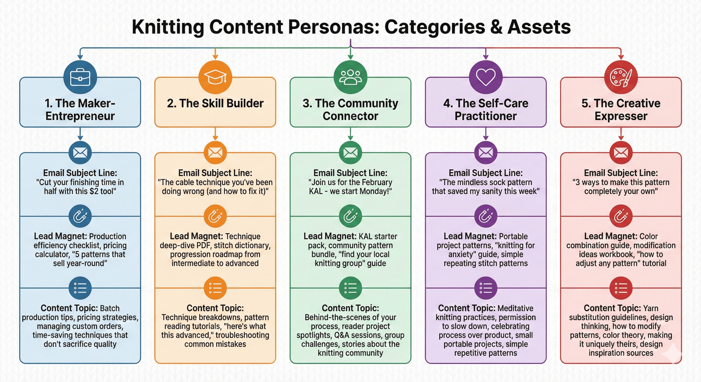 Not all knitters want the same thing from you. The person who buys your beginner-friendly cowl pattern has completely different needs than the person who wants your advanced colorwork masterclass. When you understand these different personas in your audience, you can create email content (and products) that actually resonate.